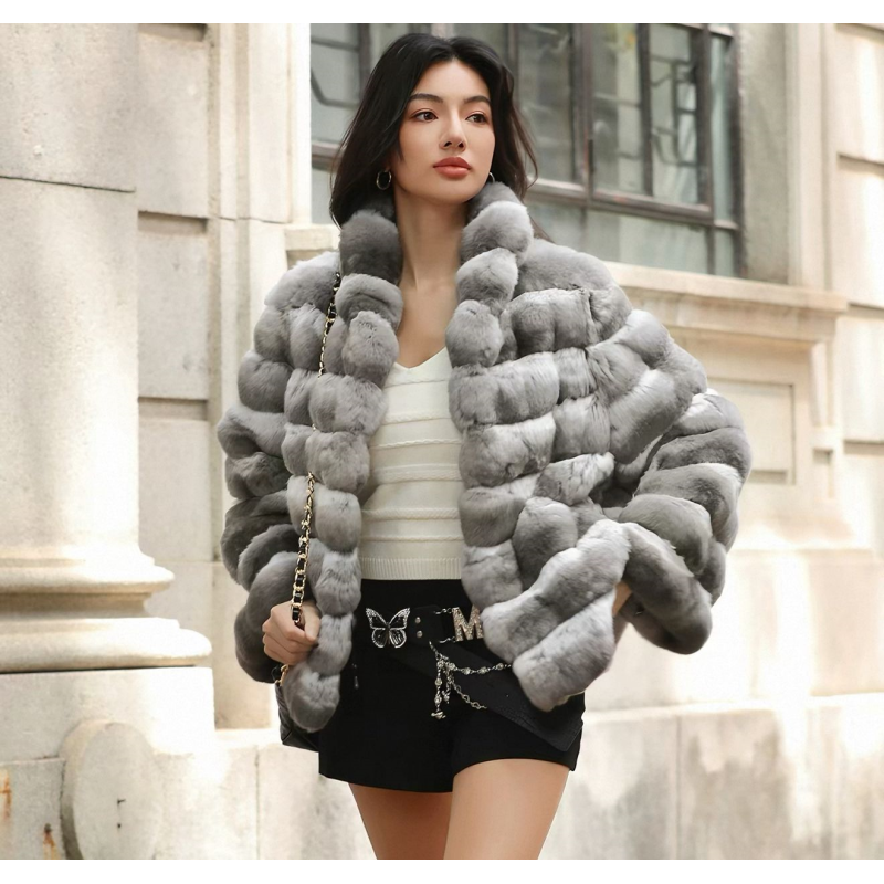 This opulent chinchilla-style 59 jacket redefines winter elegance with its plush, layered gradient gray design. Crafted from premium 60 59, it delivers cloud-like softness and exceptional warmth without compromising ethical standards. The oversized, relaxed fit and structured horizontal striping create a bold, sophisticated silhouette that effortlessly elevates any ensemble—from sleek basics to evening wear.