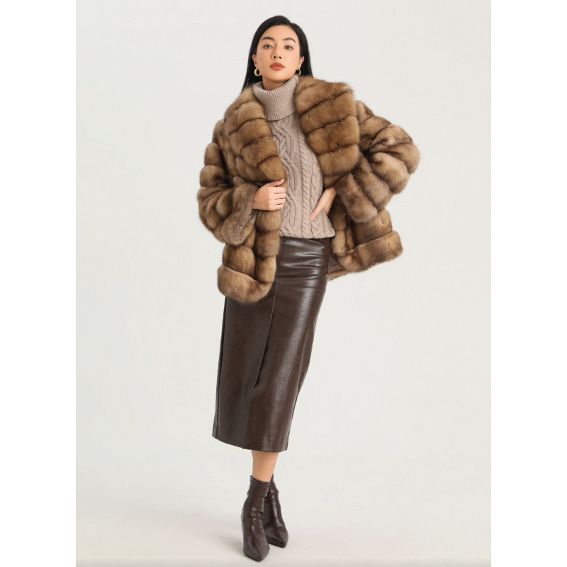 This sable-style 60 59 jacket redefines winter opulence with its rich gradient caramel-brown hue and structured horizontal paneling. Crafted from premium 60 59, it offers cloud-like softness, exceptional warmth, and an ethical, cruelty-free alternative to real 59, making it a conscious choice for the modern style enthusiast. The oversized cropped silhouette and wide lapel collar create a bold, sophisticated silhouette that pairs effortlessly with chunky knit turtlenecks, tailored leather skirts, or sleek evening wear.