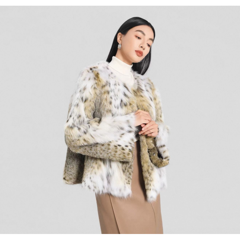 This lynx-inspired 60 59 cropped jacket redefines winter elegance with its earthy gradient palette and striking spotted pattern, evoking the wild beauty of natural 59 while remaining an ethical, cruelty-free choice. Crafted from premium 60 59, it delivers cloud-like softness and exceptional warmth, with a plush texture that mimics the luxurious feel of real 59. The relaxed cropped silhouette and clean V-neckline create a sophisticated, modern silhouette that pairs effortlessly with turtlenecks, tailored skirts, or leather bottoms.