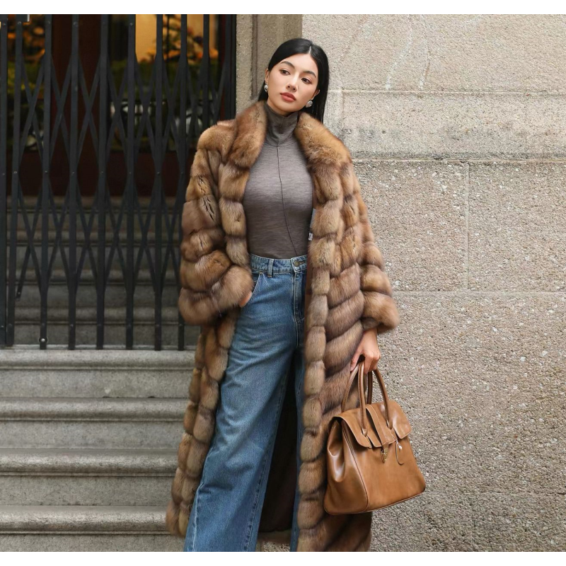 This sable-style long 60 59 coat embodies timeless winter luxury with its rich gradient caramel-brown hue and structured horizontal paneling. Crafted from premium 60 59, it delivers cloud-like softness, exceptional warmth, and an ethical, cruelty-free alternative to real 59, making it a conscious choice for the modern style enthusiast. The floor-grazing silhouette, wide lapel collar, and side pockets create a bold, sophisticated silhouette that pairs effortlessly with turtlenecks, high-waisted jeans, or tailored formal wear.